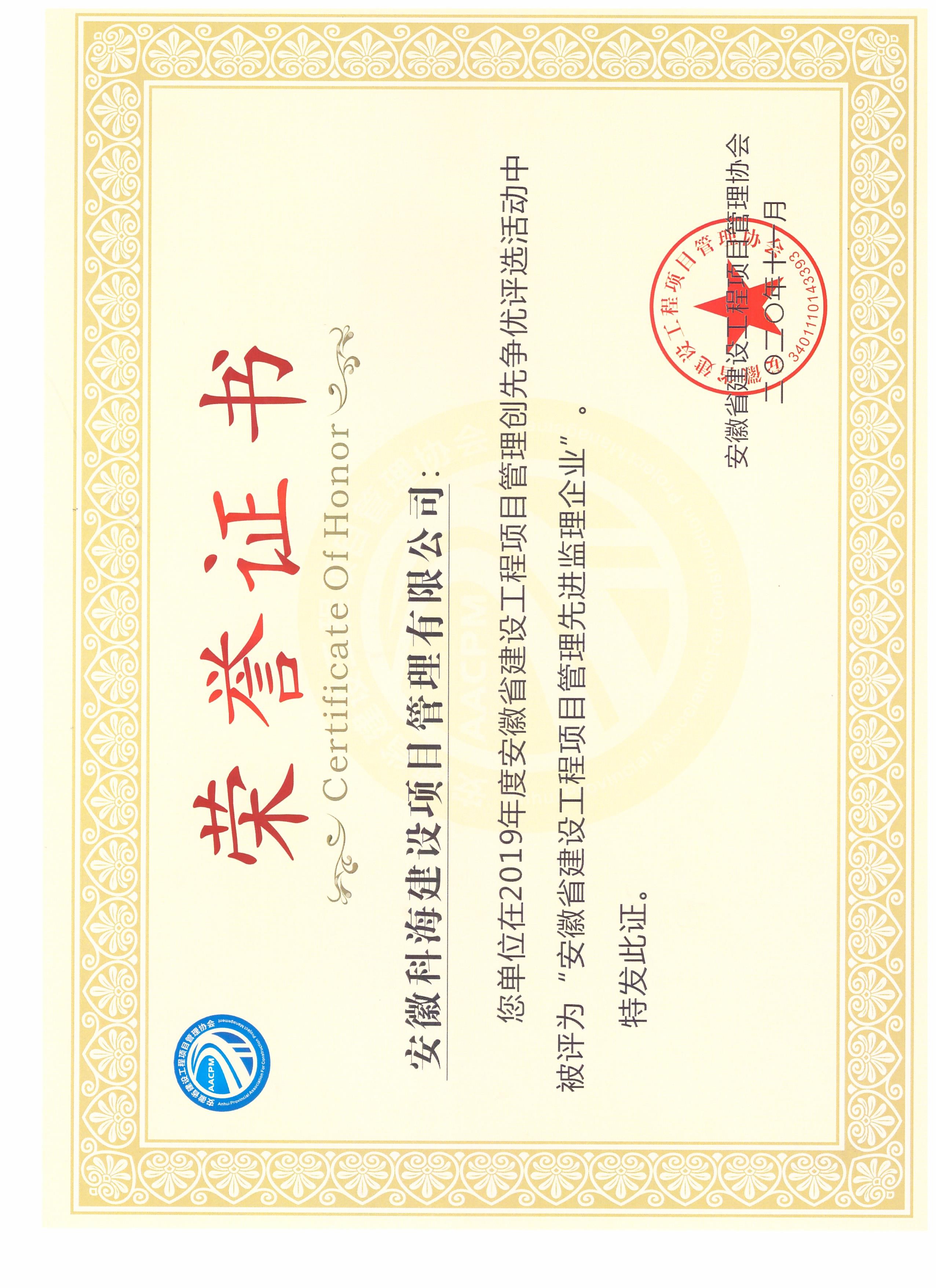 2019年度安徽省建設工程項目管理先進監(jiān)理企業(yè)