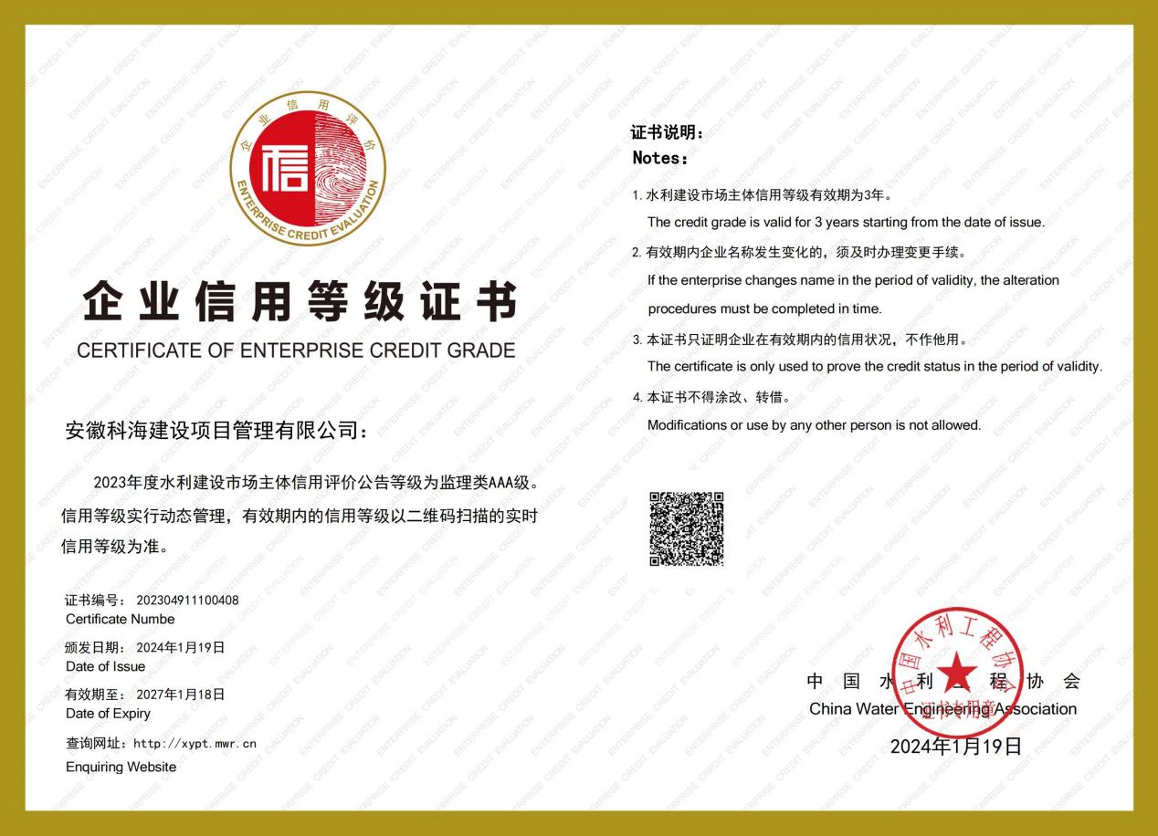 | 近期,由中國水利工程協(xié)會組織開展了關(guān)于《2023年度水利建設(shè)市場主體信用評價工作的通知》,依據(jù)《水利建設(shè)市場主體信用信息管理辦法》、《水利建設(shè)市場主體信用評價管理辦法》相關(guān)規(guī)定,我司榮獲“2023年度中國水利工程協(xié)會AAA信用等級”榮譽稱號。 科海人長期注重品質(zhì)建設(shè),以品牌、創(chuàng)新、管理、專業(yè)和服務理念在安徽省監(jiān)理行業(yè)打造一支具有較核心競爭力和良好口碑的團隊。公司始終堅持科學發(fā)展做創(chuàng)新企業(yè),海納百川鑄誠信品牌的經(jīng)營方針,憑借著專業(yè)的人才技術(shù),為業(yè)主監(jiān)造滿意工程,持續(xù)為社會創(chuàng)造更大價值。